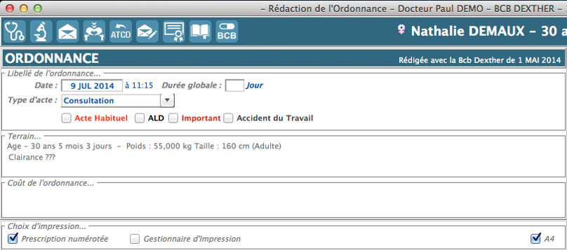 Cochez A4 pour éditer les ordonnances au format A4 au lieu du format A5 (Sécu) défini par défaut.