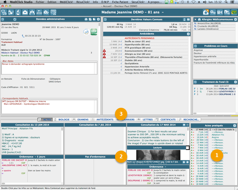 : Présentation groupée : Cette présentation permet de naviguer dans l’historique du dossier patient (1) par type de données (3). Les données sont présentées chronologiquement par groupe de trois (Détail de l'information : 2).