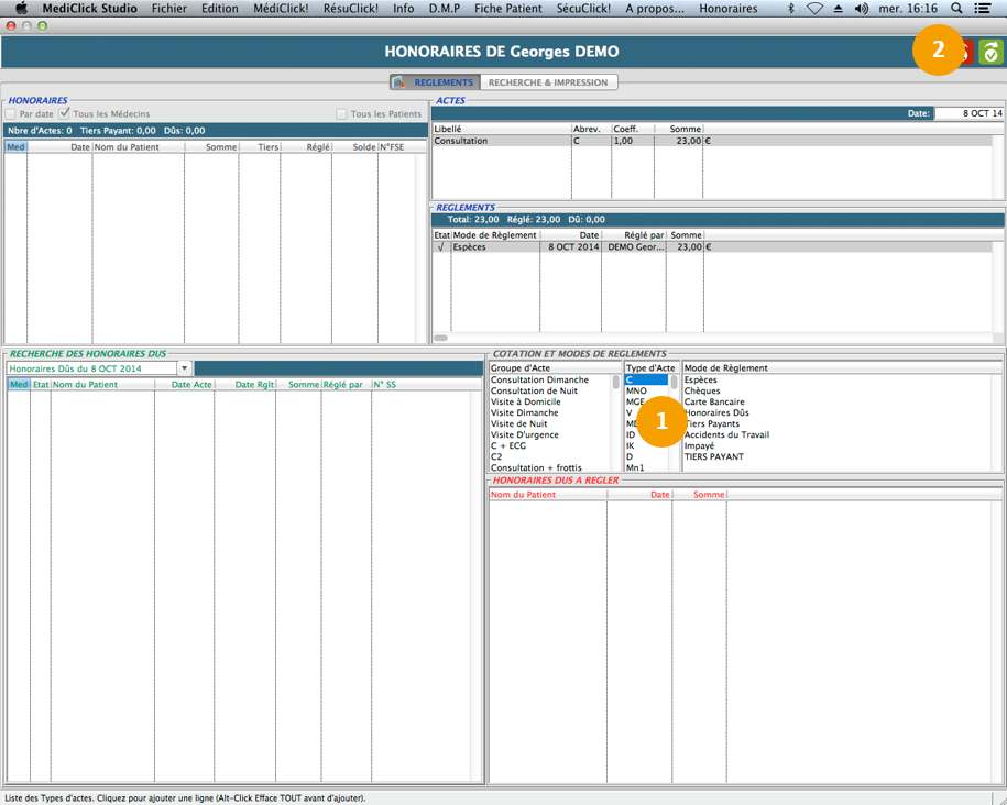 Sélectionnez l'acte ou le groupe d'actes et le mode de règlement du patient.