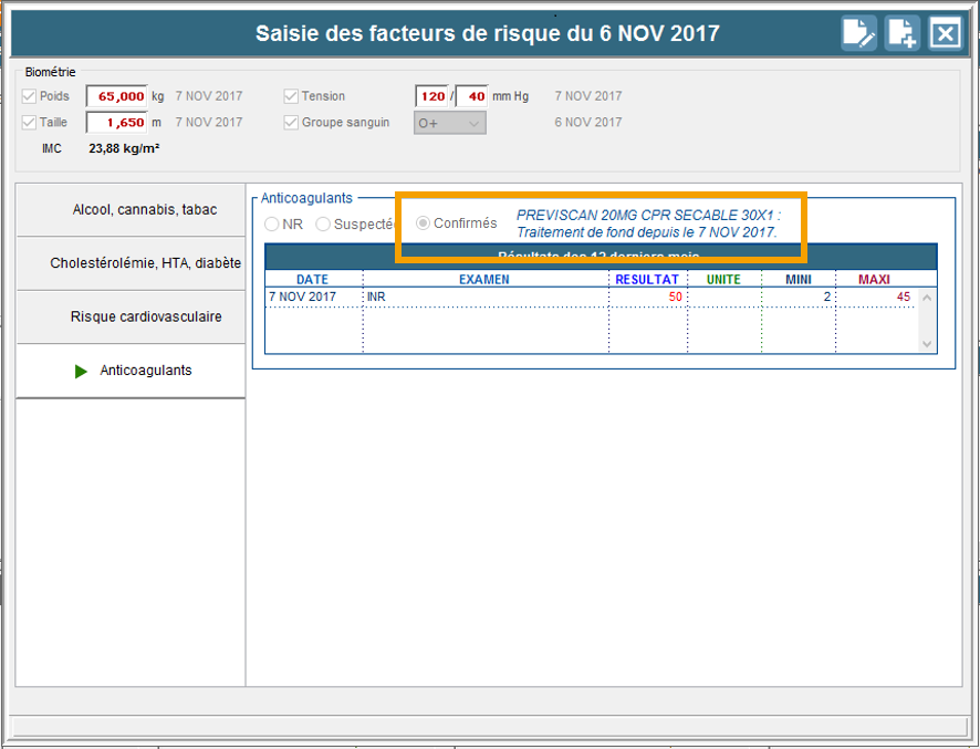 Dans le cas où une valeur INR est supérieure à la norme et un traitement de fond actif de prise d'anticoagulant a été renseigné.