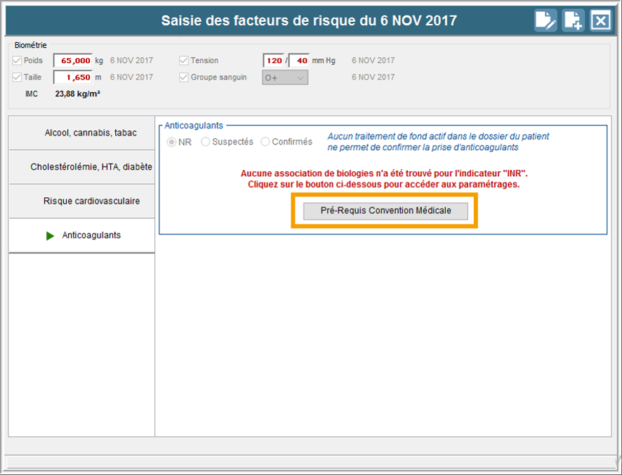 • Une fois les éléments de Pré-Requis Convention Médicale renseignés, tel que l'INR, l'écran suivant apparaît :