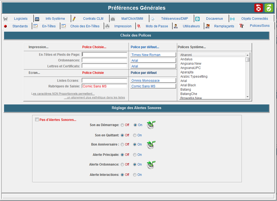 Depuis cet onglet, vous pouvez définir des polices de caractères pour vos impressions, votre écran, etc... mais aussi des alertes sonores pour certains évènements (démarrage de MédiClick, Anniversaire d'un patient, alerte sur les prescriptions médicamenteuses, etc...).