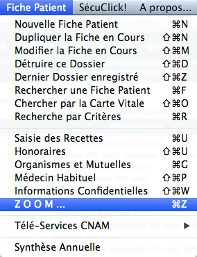 Pour accéder à cette fonction, cliquez sur le menu Fiche patientZoomou par le raccourci clavier CMD + Z ou Pomme + Z sur MAC et CRTL + Z sur PC. La répétition des touches CTRL + Z ou Pomme + Z affiche ou masque la fenêtre Zoom.