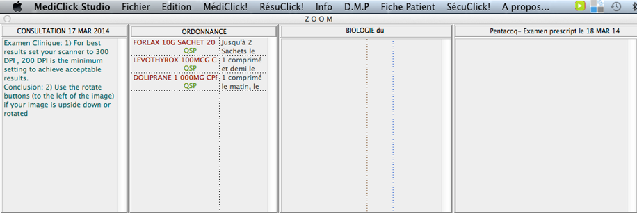 La fonction Zoom permet de visualiser un résumé des derniers éléments créés dans le dossier patient soit la dernière consultation avec l'ordonnance qui lui est rattachée, le dernier examen de biologie et le dernier examen complémentaire.
