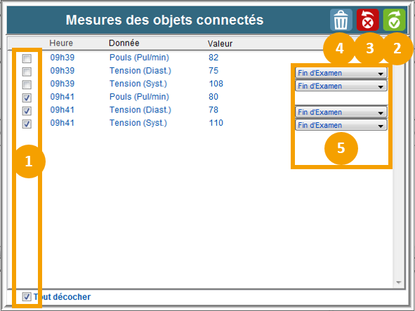 Dans cette fenêtre, il est possible de retrouver plusieurs mesures prises par un même objet. Par défaut, seules les dernières mesures seront cochées, donc prêtes à être intégrées dans la consultation.