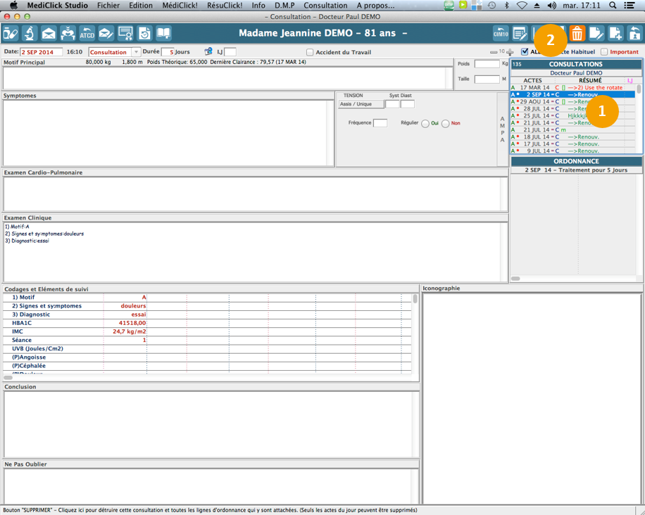 Double-cliquez sur la consultation à supprimer, depuis l'écran d 'accueil de MédiClick comme ci-dessus ou encore directement après avoir cliqué sur le bouton