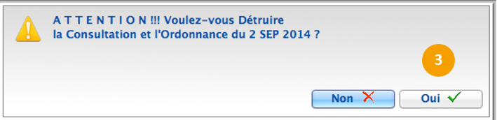 .Un message de confirmation apparaît, cliquez sur Oui pour supprimer définitivement la consultation et l'ordonnance qui lui est rattachée.