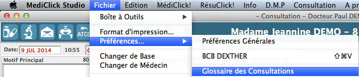 Cochez l'option Palette Glossaire pour afficher la palette Glossaire (termes de votre glossaire de consultation) en rédaction de consultation. Lors de la saisie des rubriques motifs, diagnostic, conclusion , les termes de votre glossaire vérifiant les premières lettres de votre saisie vous seront proposés pour sélection. Les termes de ce glossaire sont en texte libre. Ils sont définis dans le Glossaire des consultations.