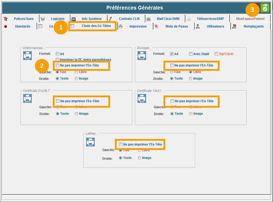 Pour cela, il vous suffira d'aller dans les préférences générales de MédiClick onglet Choix des En-Têtes et cocher l'option Ne pas imprimer l'En-Tête pour chaque type de document que vous souhaitez :