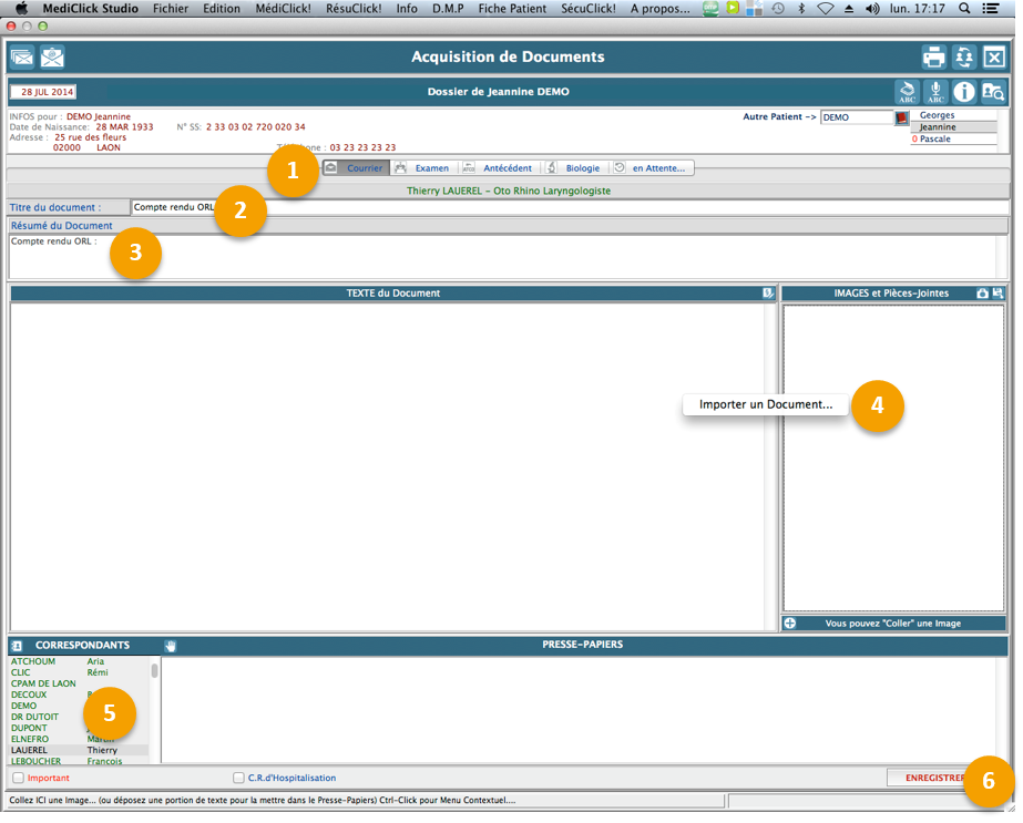 Sélectionnez l'emplacement où vous souhaitez ranger le document dans le dossier du patient (Courrier, Examen, Antécédent, Biologie ou encore Document en attente).