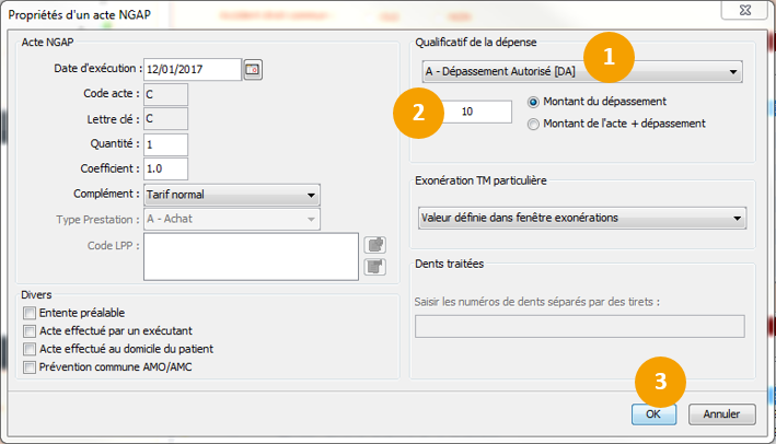 En cours d'élaboration d'une feuille de soins, vous avez la possibilité de saisir ponctuellement, un dépassement pour un acte.