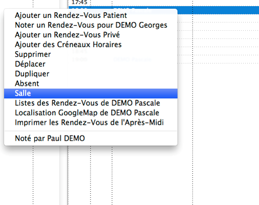 Pour cela, effectuez un CTRL + clic (Mac) ou clic droit (PC) sur le RDV et sélectionnez Salle ou Absent.