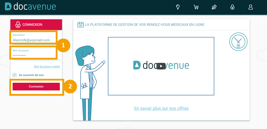 Une fois inscrit sur le site de Docavenue, vous pourrez vous connecter au site de Docavenue via l'identifiant et mot de passe que vous aurez reçu par mail dès la validation de votre inscription à Docavenue.