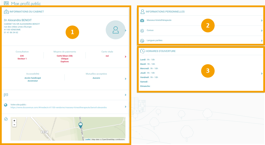1. Complétez ici les informations du cabinet (L'adresse, le prix de la consultation, les modes de règlements acceptés, l'accessibilité aux handicapés...)