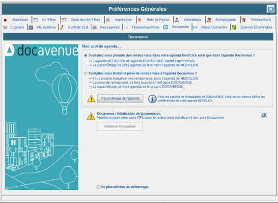 Pour les nouvelles installations de MédiClick, si les préférences de l'agenda de MédiClick n'ont pas été définies, elles devront être renseignées avant de pouvoir initialiser Docavenue, via le bouton Paramétrage de l'agenda.