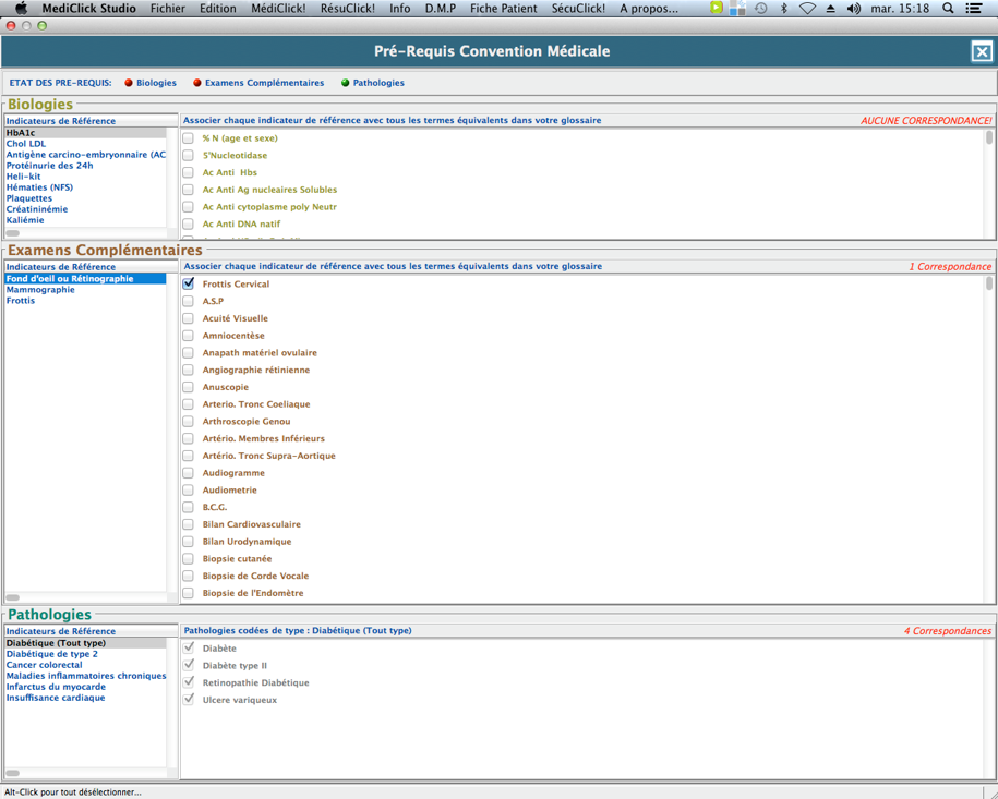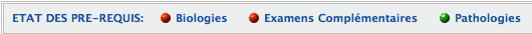 En partie supérieure de l'écran sont affichés les états des pré-requis relatifs aux rubriques Biologie, Examens complémentaires, Pathologie de MédiClick.