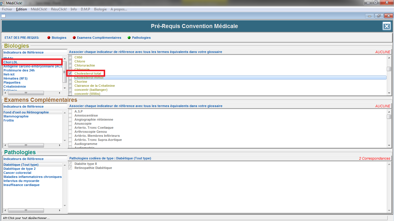 Sélectionnez depuis la zone Biologie, l’examen Chol LDl et associez de façon exhaustive tous vos examens de biologie personnels utilisés dans le cadre de la prescription d’une biologie Chl LDL.