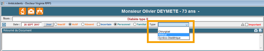 Lors de la création d'un nouvel antécédent, vous avez la possibilité d'indiquer, à l'aide du menu déroulant, si votre antécédent personnel est de type :