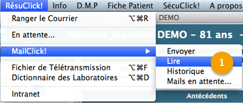 Vous êtes dans la fenêtre MailClick. La réception des documents se fait automatiquement, MédiClick récupère les analyses ou courriers et les décrypte aussitôt.