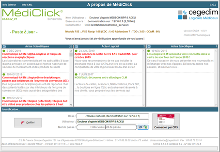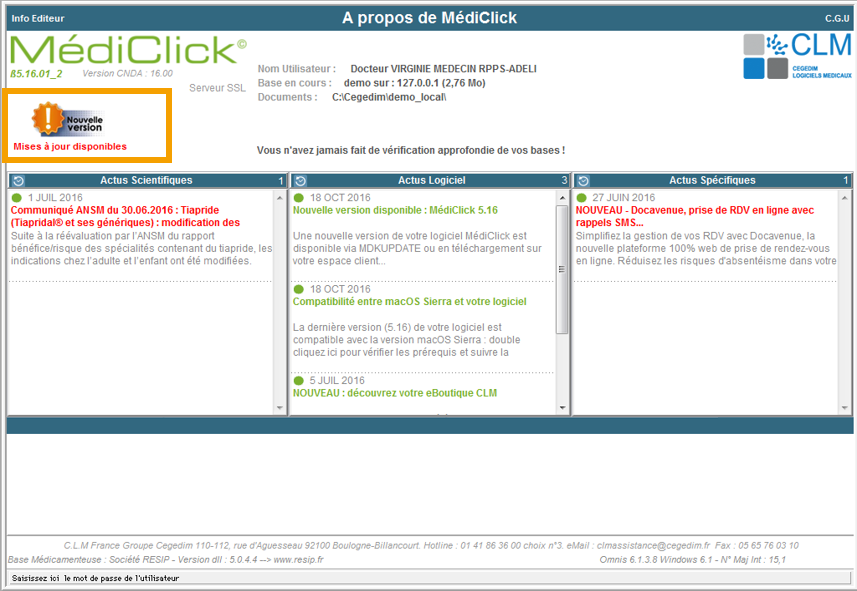 Au démarrage de votre logiciel, l'écran d'accueil indique si des mises à jour sont disponibles pour votre poste de travail et votre version de MédiClick installée.