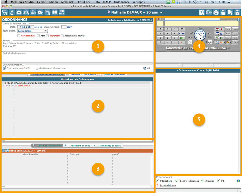 La calculette de prescription, qui permet de rechercher un médicament dans la base médicamenteuse BCB, et d’ajuster la posologie BCB si nécessaire. (Zone 4 : Calculette de prescription)