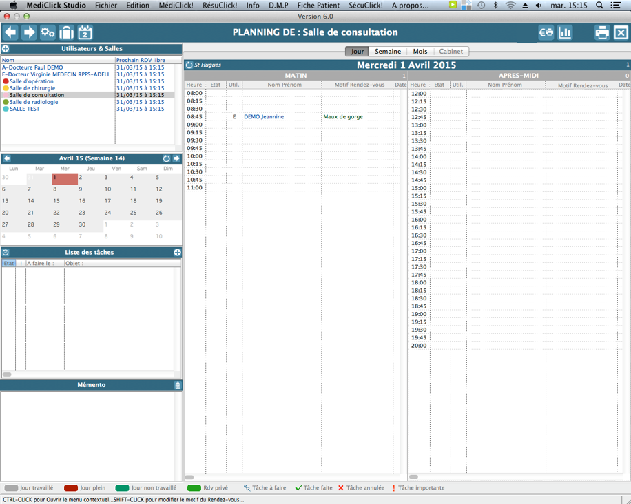 Le Rendez-vous apparaît ici avec une couleur devant, qui correspond à la couleur attribuée à la salle lors du paramétrage des préférences de la salle.