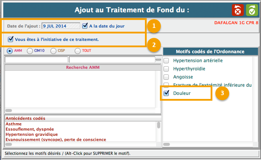 Double-cliquez sur l’antécédent pour le sélectionner, l’antécédent apparaît dans les Motifs codés de l’Ordonnance.
