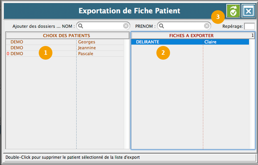 2. Lorsque vous double-cliquez sur le patient, celui-ci passe dans la liste de droite Fiches à exporter.