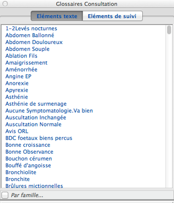 La palette nommée Glossaire des Consultations apparaît en avant plan. Sa position est modifiable en cliquant sur son bandeau et en la faisant glisser ailleurs.