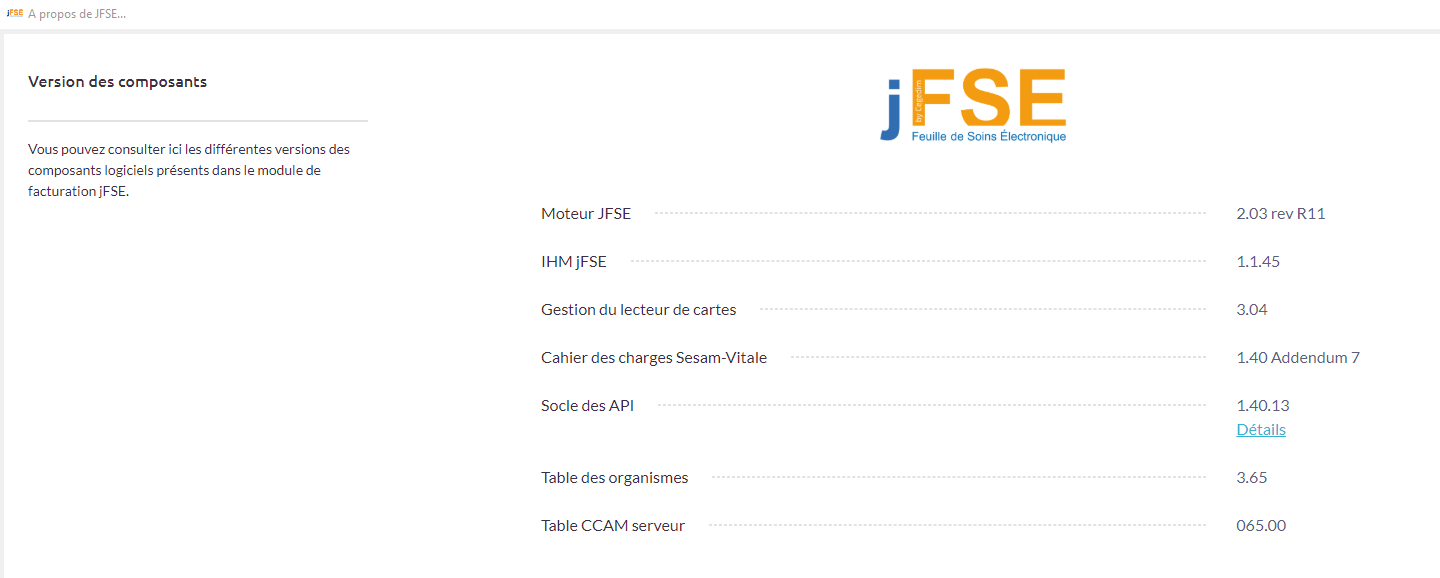 | . | Aide en ligne MédiClick - version 22.00 > La Feuille de soins (JFSE V2) > Les paramétrages > Connaître la version des composants Sesam Vitale |