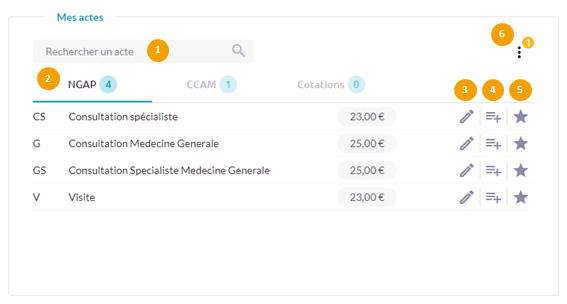1. Zone qui vous permet de rechercher des actes NGAP, CCAM et Cotations,