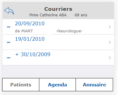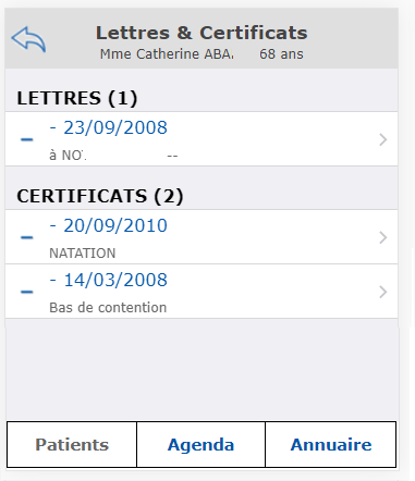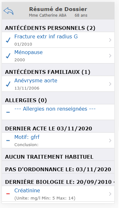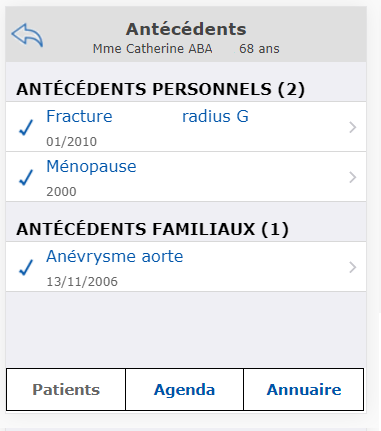 • Les antécédents : Visualisez le liste des antécédents saisis dans le dossier du patient.