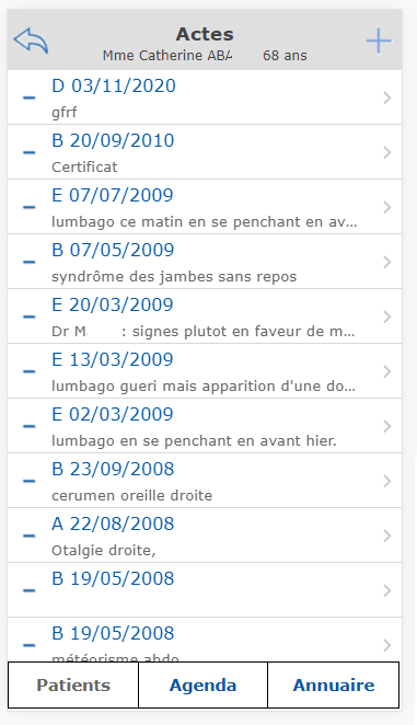 • Les actes : Liste des différents actes saisis dans le dossier du patient