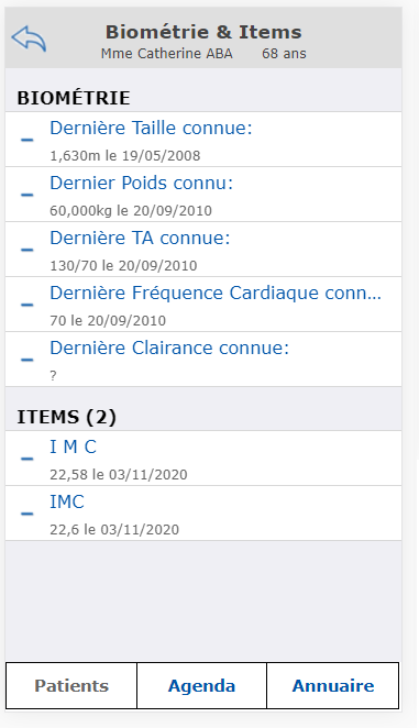 • La biométrie & Items : visualisation de la biométrie saisie dans le dossier du patient.