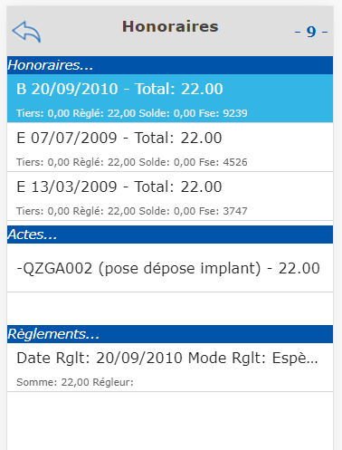 • Les honoraires : visualisation des honoraires et des actes facturés.