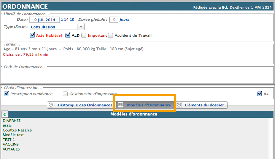 Un modèle d’ordonnance est constitué d’une prescription définie pour une pathologie donnée. Tous les modèles sont répertoriés dans l’onglet .