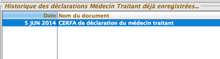 La zone Historique des Déclarations Médecin Traitant déjà enregistrées indique les DMT réalisées pour le patient. Double-cliquez sur une ligne pour éditer ou imprimer le CERFA.
