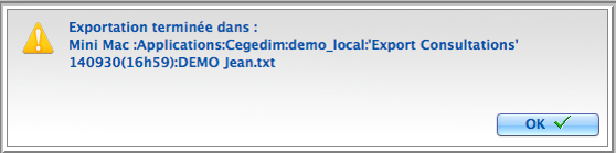 MédiClick affiche alors un message avec le chemin où la consultation a été exportée, par exemple : Applications:Cegedim:demo_local:Export Consultations140930(16h59) : DEMO Jean.txt