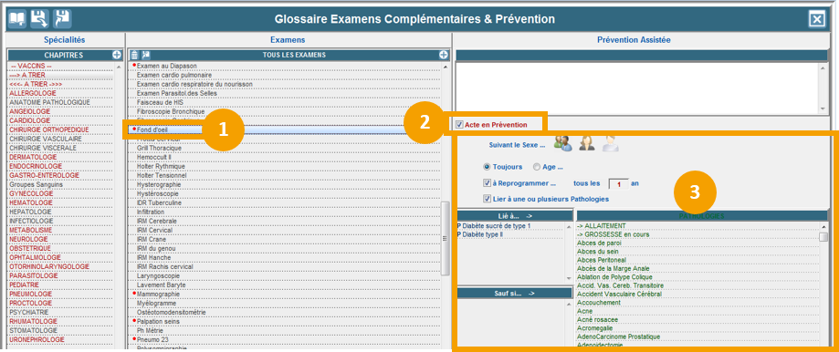 Depuis le glossaire des examens, il est possible mettre en prévention des examens, pour cela :