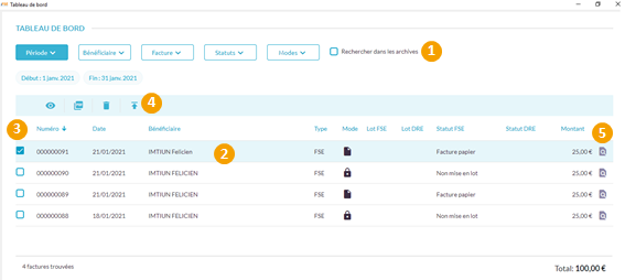 3. Cases à cocher permettant de sélectionner une ou plusieurs feuilles de soins ; c'est sur cette sélection que les boutons d'actions agissent