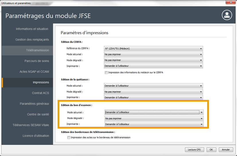 2. Dans la section Edition du bon d'examen, sélectionnez dans le menu déroulant, l'option souhaitée pour le Mode sécurisé et/ou dégradé :