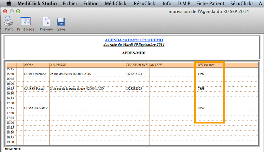 Lorsque vous imprimez les RDV du jour, le numéro de dossier patient est repris.