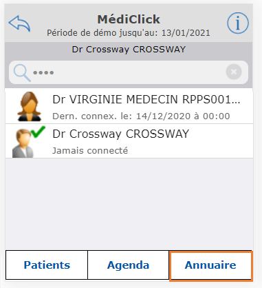 Depuis MédiClick Mobile Édition, vous pouvez accéder à votre annuaire des correspondants MédiClick, en cliquant sur l'onglet Annuaire :