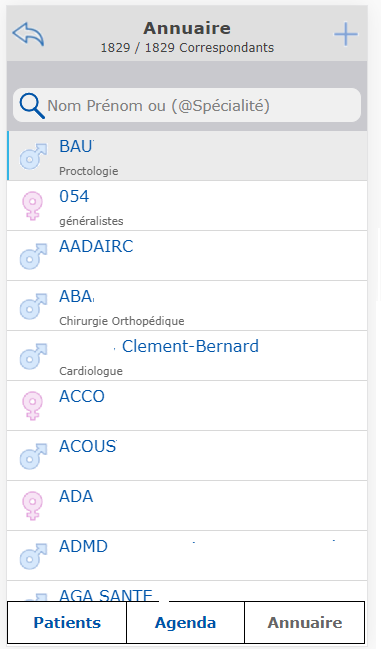 Pour rechercher un correspondant par sa spécialité, saisissez un @ devant la spécialité (ex : @cardiologue)