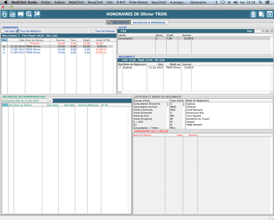 Recherche des règlements par période, mode de règlements, par patient ou sur l'intégralité de votre patientèle...