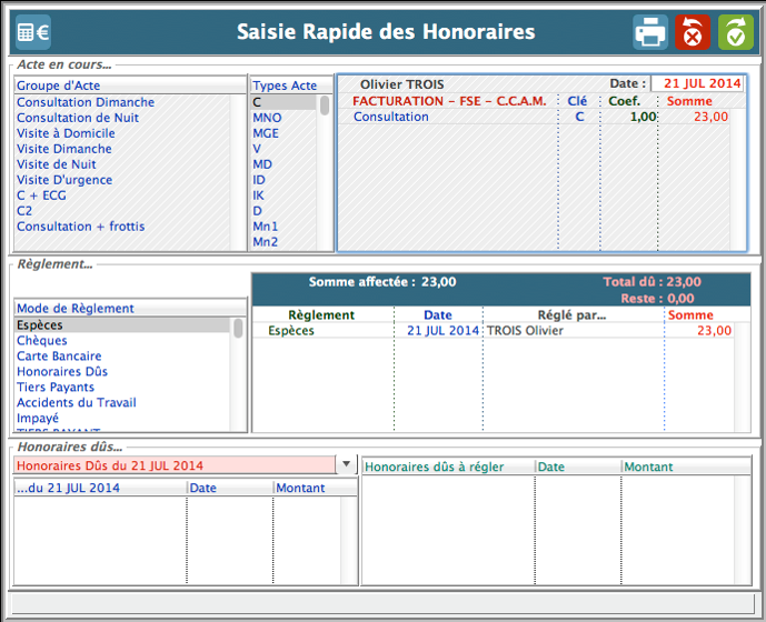 Sélectionnez l'acte pratiqué sur le patient (Ex : C pour la consultation). Si vous avez fait une FSE juste avant, l'acte est automatiquement affecté au patient.