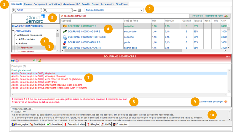 • Posologie : Cet onglet est affiché par défaut à l’ouverture de la palette.