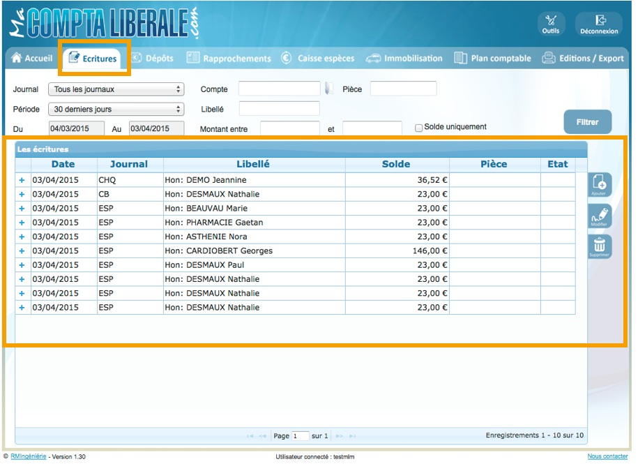 Retrouvez vos honoraires exportés sur https://www.macomptaliberale.com depuis l'onglet Écritures :