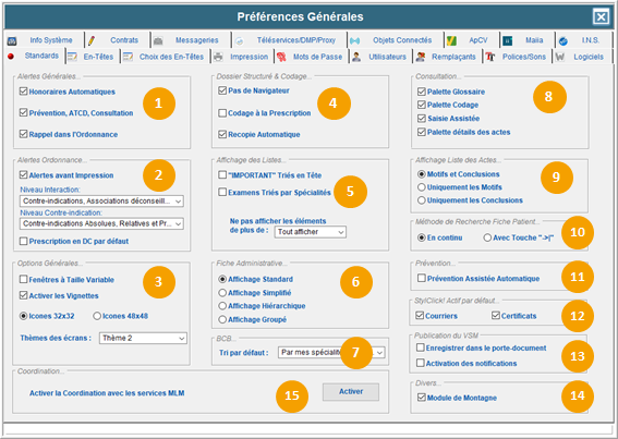 Dans l'onglet Standards des Préférences Générales de MédiClick, il est possible de paramétrer ou modifier l'utilisation du logiciel :