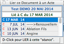 Permet de rattacher chronologiquement le document reçu à une consultation donnée. L’ensemble des actes réalisés est affiché : un double-clic sur un acte rattache le courrier à cet acte. La combinaison de la touche Alt + clic sur une ligne de la liste Courriers Reçus permet aussi d’accéder à cette fonctionnalité |